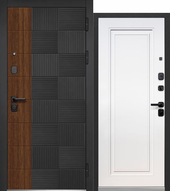 Luxor 2МДФ Квадрат Нео — входная дверь серии LUXOR от Феррони. Снаружи: фрезерованная МДФ-панель 12 мм, цвет пленки «Антрацит софт», «Грецкий орех». Внутри: фрезерованная МДФ-панель 16 мм, цвет пленки «Эмалит белый».