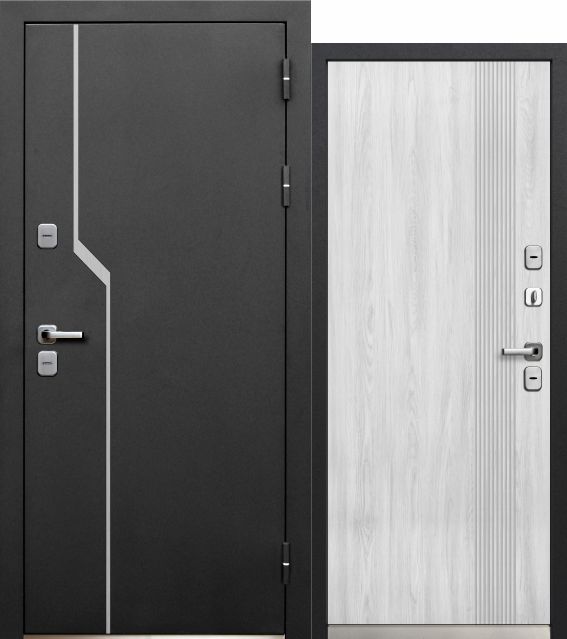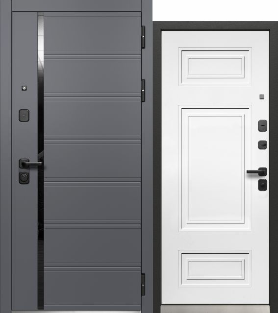Luxor 2МДФ Вертикаль — входная дверь серии LUXOR от Феррони. Снаружи: фрезерованная МДФ-панель 12 мм, цвет пленки «Сатин графит». Внутри: - фрезерованная МДФ-панель 16 мм, цвет пленки «Эмалит белый» - МДФ-панель 16 мм, цвет пленки «Эмалит белый», встроенное «зеркало в пол».