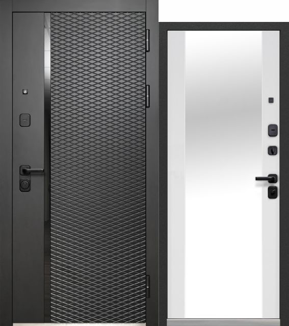 Luxor 2МДФ Ромбы Вертикаль Зеркало — входная дверь серии LUXOR от Феррони. Снаружи: фрезерованная МДФ-панель 12 мм, вставка черный лакобель, цвет пленки «Антрацит софт». Внутри: МДФ-панель 16 мм, цвет пленки «Эмалит белый», встроенное «зеркало в пол».