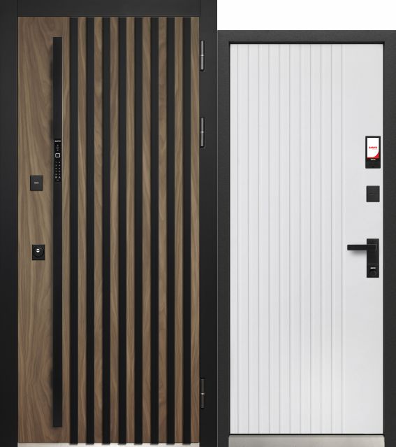 Luxor 2МДФ Смарт 3Д Рейка — входная дверь серии LUXOR от Феррони. Снаружи: фрезерованная МДФ-панель 10 мм, цвет пленки «Сатин черный», «Орех американский мокко». Внутри: МДФ-панель 16 мм, цвет пленки «Эмалит белый».