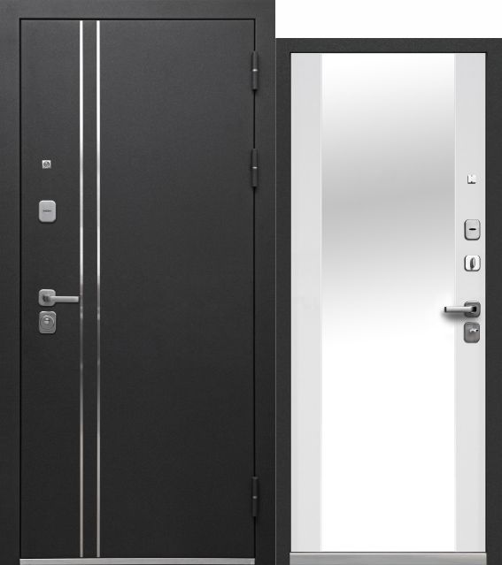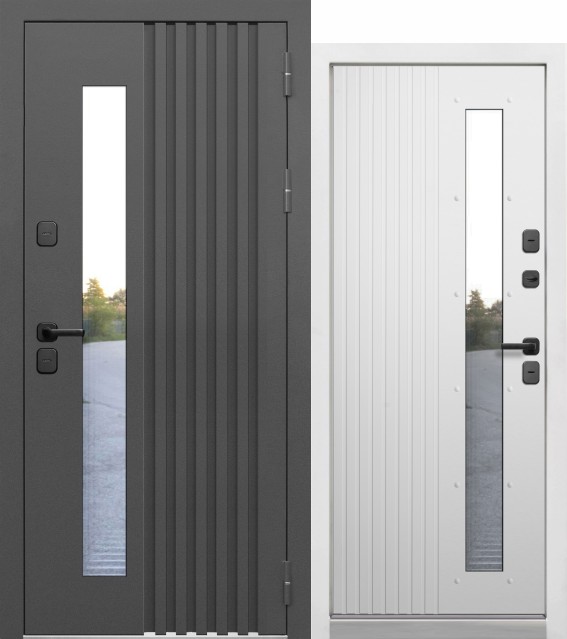 Luxor 2МДФ Вертикаль Зеркало — входная дверь серии LUXOR от Феррони. Снаружи: фрезерованная МДФ-панель 12 мм, цвет пленки «Сатин графит». Внутри: - фрезерованная МДФ-панель 16 мм, цвет пленки «Эмалит белый» - МДФ-панель 16 мм, цвет пленки «Эмалит белый», встроенное «зеркало в пол».