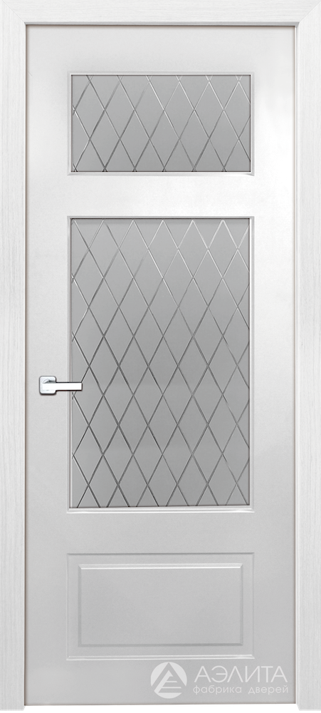 В пилотной витрине показываем два основных варианта: глухое и остеклённое исполнение. Для остекления в техническом каталоге Аэлиты указано стекло Matelux 4 мм с алмазной гравировкой. Это хороший выбор для гостиной, холла, кухни или проходной зоны, где хочется сохранить свет, но не делать дверь полностью прозрачной.