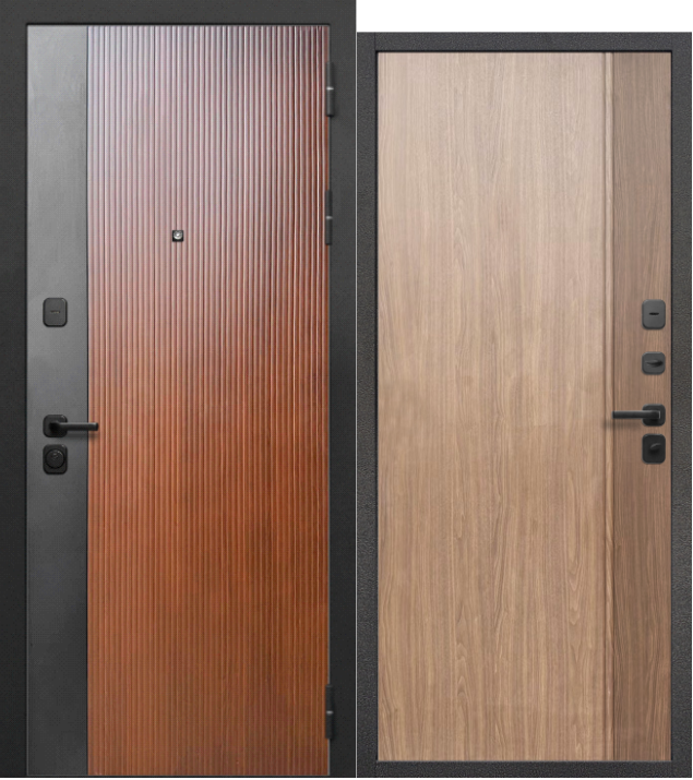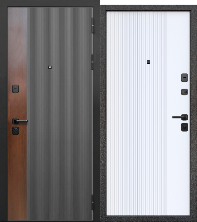 - Варианты отделки. Белая: снаружи «Грецкий Орех/Муар Черный», внутри «Вертикаль Белая»; Серая: снаружи «Сатин Серый/Муар Черный», внутри «Вертикаль Серая»; Орех: снаружи «Сатин Черный/Грецкий Орех», внутри «Канадский Орех».