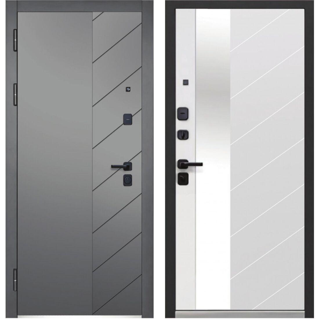 Luxor 2МДФ Пирамида Зеркало дает снаружи спокойную графитовую отделку, а внутри светлую МДФ-панель с зеркалом в полный рост. Это практичный вариант для квартиры: зеркало работает как часть прихожей, а полотно 115 мм, короб 128 мм и три контура уплотнения добавляют тишины и плотности закрывания. По размерам доступны стандартные исполнения 860х2050 и 960х2050 мм с левым или правым открыванием.