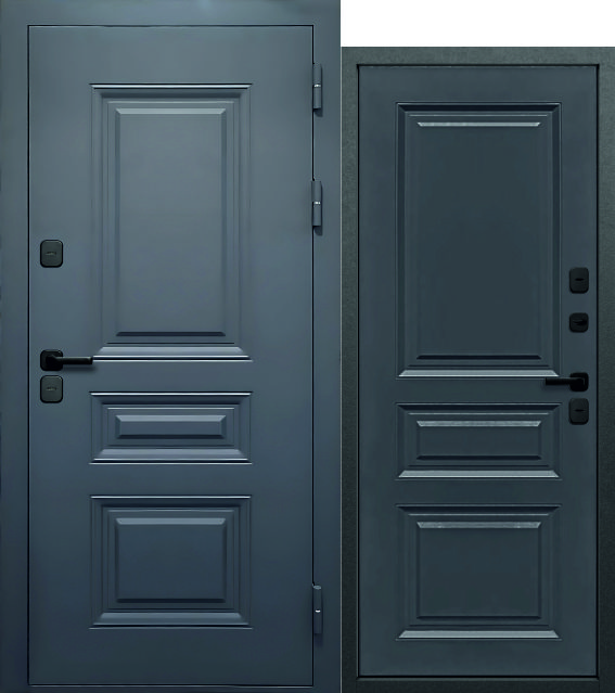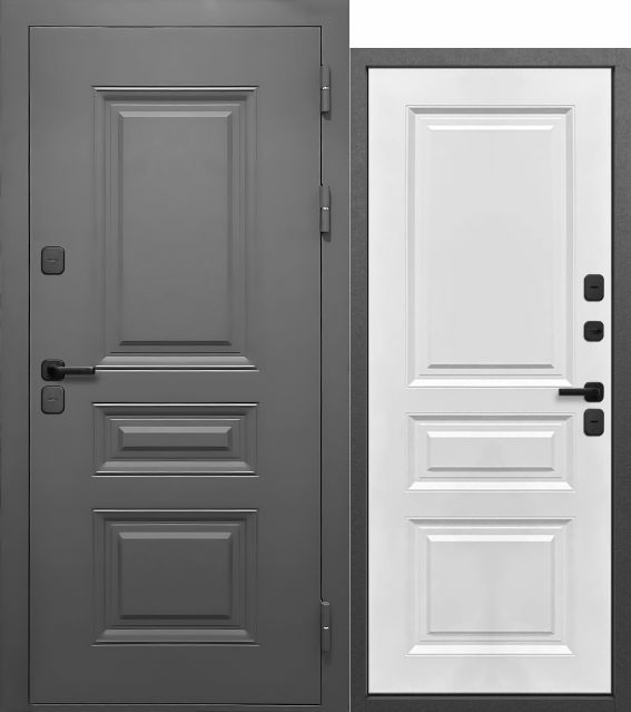 Luxor Термо Классика Муар 7024 — входная дверь LUXOR TERMO с терморазрывом 24 мм, внешней серой отделкой и двумя вариантами внутренней панели: Сатин белый или Сатин графит.