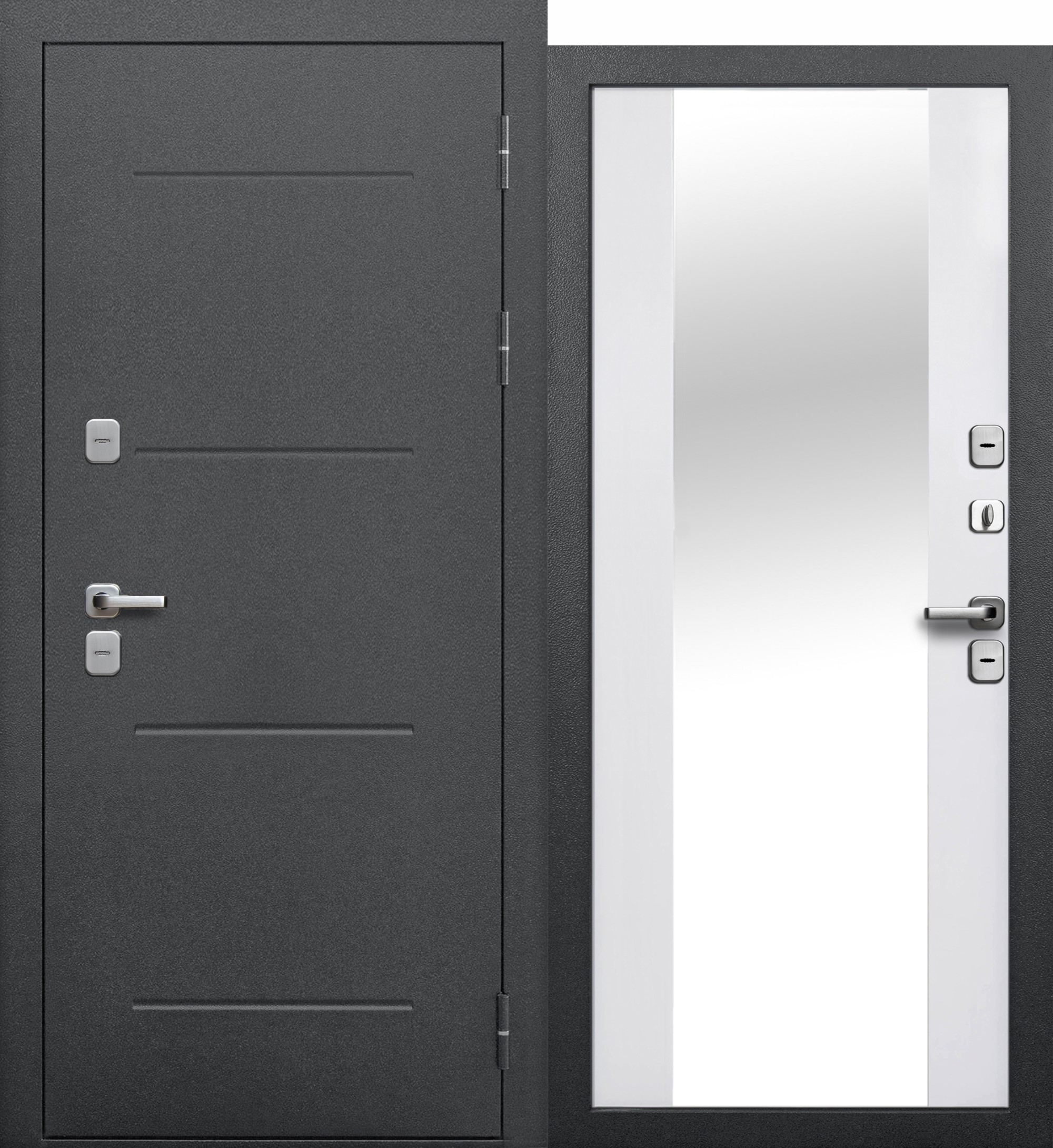 11 см ISOTERMA Серебро Эмалит белый Зеркало — входная дверь Феррони серии ISOTERMA с внешним покрытием атмосферостойкое порошково-полимерное «Антик серебро». Доступные размеры: 860x2050, 960x2050 мм. Терморазрыв 24 мм на полотне и коробе помогает снизить промерзание при уличной установке.