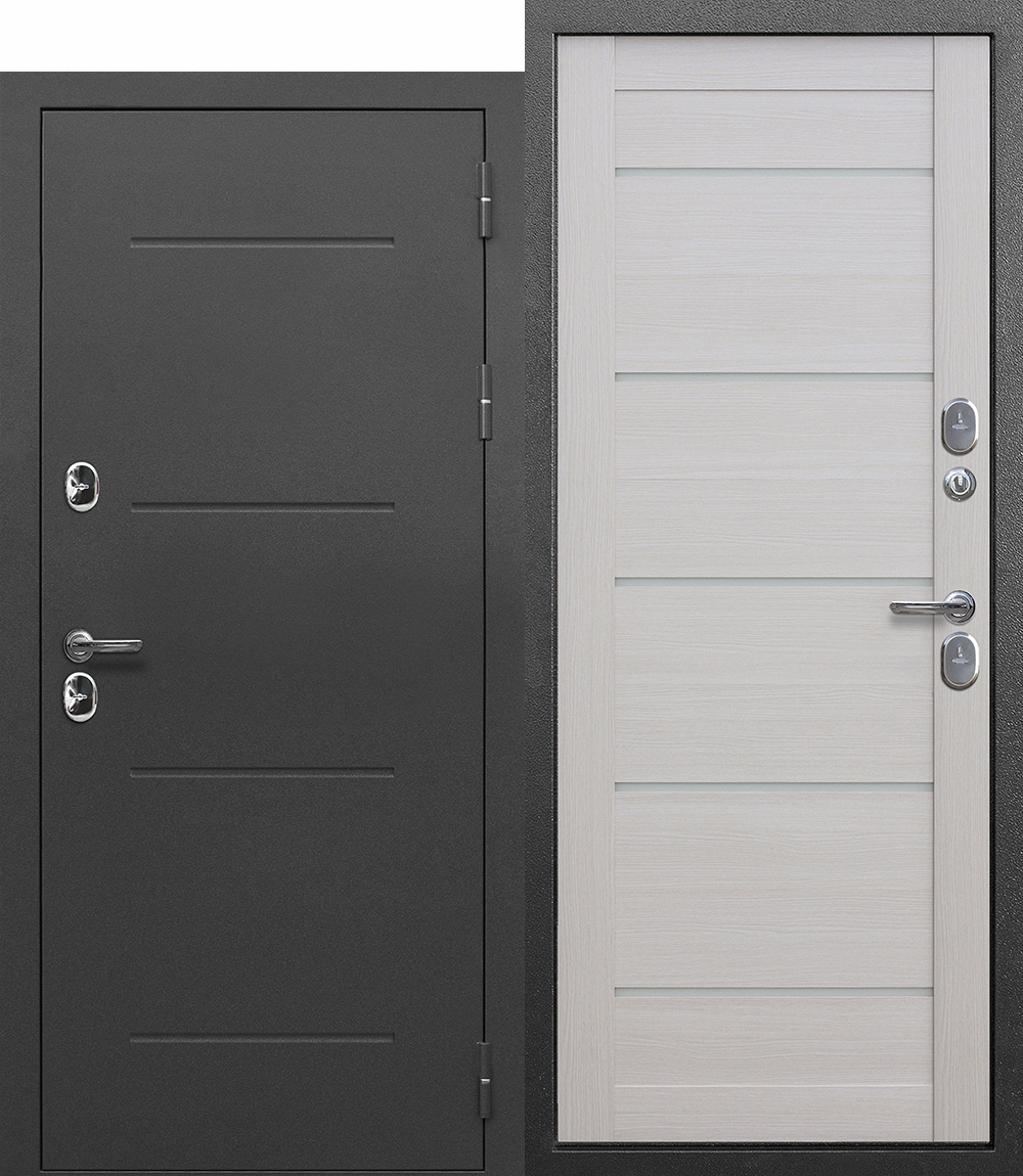 11 см ISOTERMA Серебро Лиственница беж Царга — входная дверь Феррони серии ISOTERMA с внешним покрытием атмосферостойкое порошково-полимерное «Антик серебро». Доступные размеры: 860x2050, 960x2050 мм. Терморазрыв 24 мм на полотне и коробе помогает снизить промерзание при уличной установке.