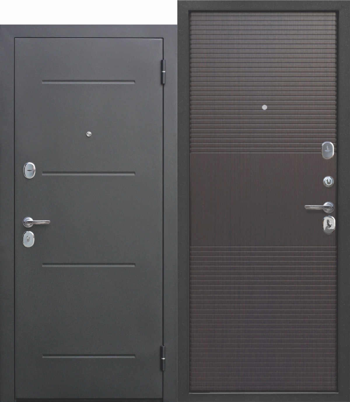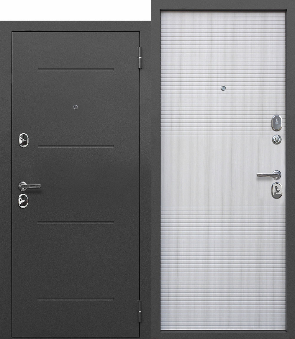 7,5 см Гарда Серебро — входная дверь Феррони с внешним покрытием «Антик серебро» и двумя вариантами внутренней МДФ-панели: «Белый ясень» или «Темный кипарис».