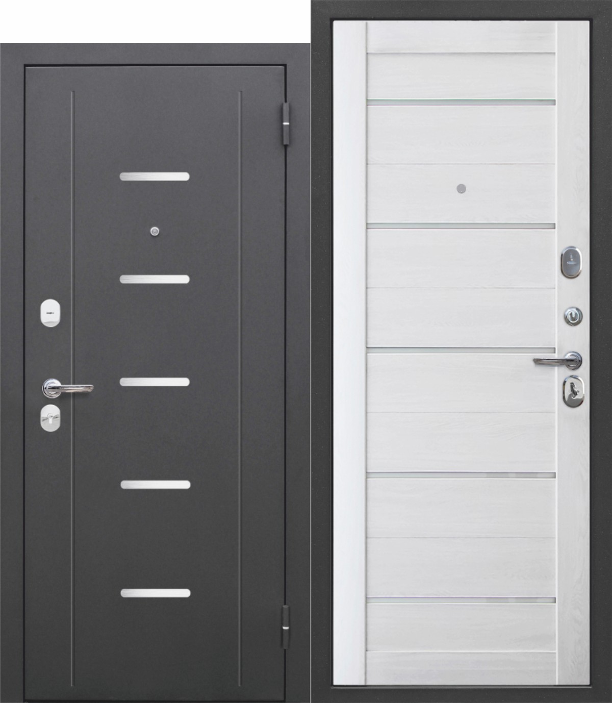 7,5 см Гарда Серебро Царга — практичная дверь Ferroni с более спокойной серебристой внешней отделкой и интерьерными царговыми панелями. Внутри доступны Астана милки, Бетон снежный и Дуб Неаполь грей. Панель выполнена из МДФ 16 мм с покрытием экошпон и глянцевыми вставками Лакобель. Полотно 75 мм, короб 105 мм, два контура уплотнения и два замка MANGYST IV класса закрывают основные требования к надежной входной двери.