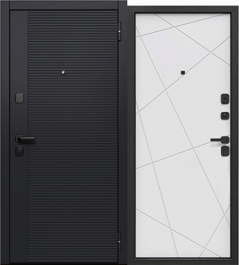 Черный Кварц Сатин белый — входная дверь Ferroni с фрезерованными МДФ-панелями, полотном 85 мм и светлой внутренней отделкой.