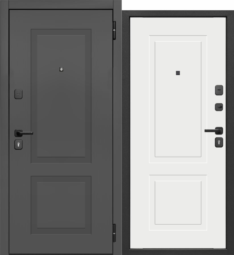 Гарда 2 МДФ — входная дверь Феррони с двумя МДФ-панелями: снаружи «Сатин графит», внутри «Эмалит белый». Полотно 75 мм, короб 90 мм, два контура уплотнения.