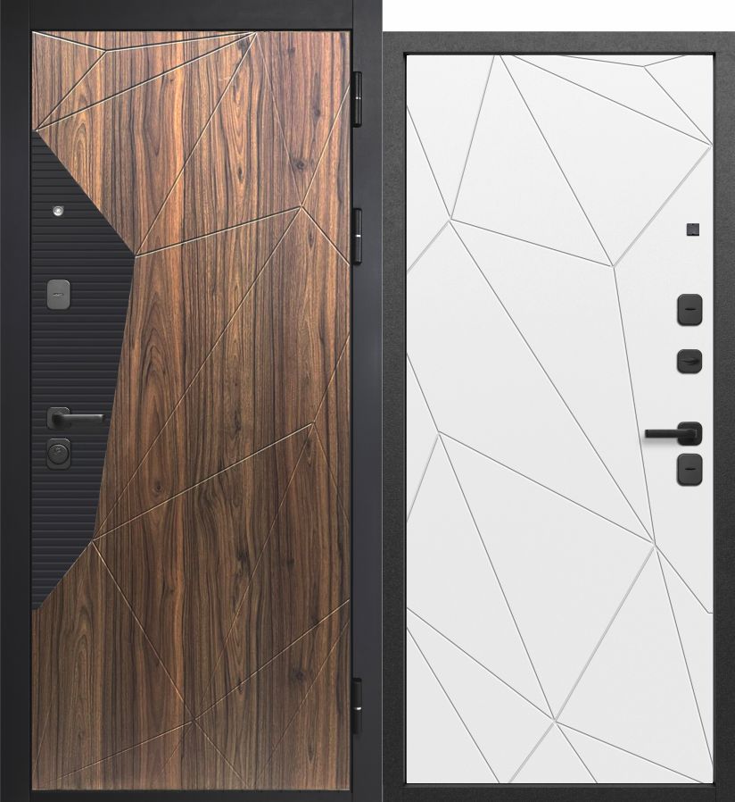 9 см Геометрия Эмалит белый — входная дверь Феррони серии Геометрия с внешним покрытием сборная МДФ-панель 10 мм, цвет – «сатин черный», «орех каньон коньяк». Доступные размеры: 860x2050, 960x2050 мм.