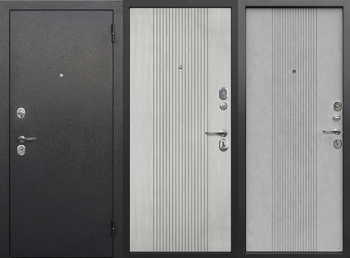 SuperNova Серебро — входная дверь Ferroni с покрытием «Антик серебро» и двумя спокойными вариантами внутренней панели: «Белый ясень» и «Бетон снежный».