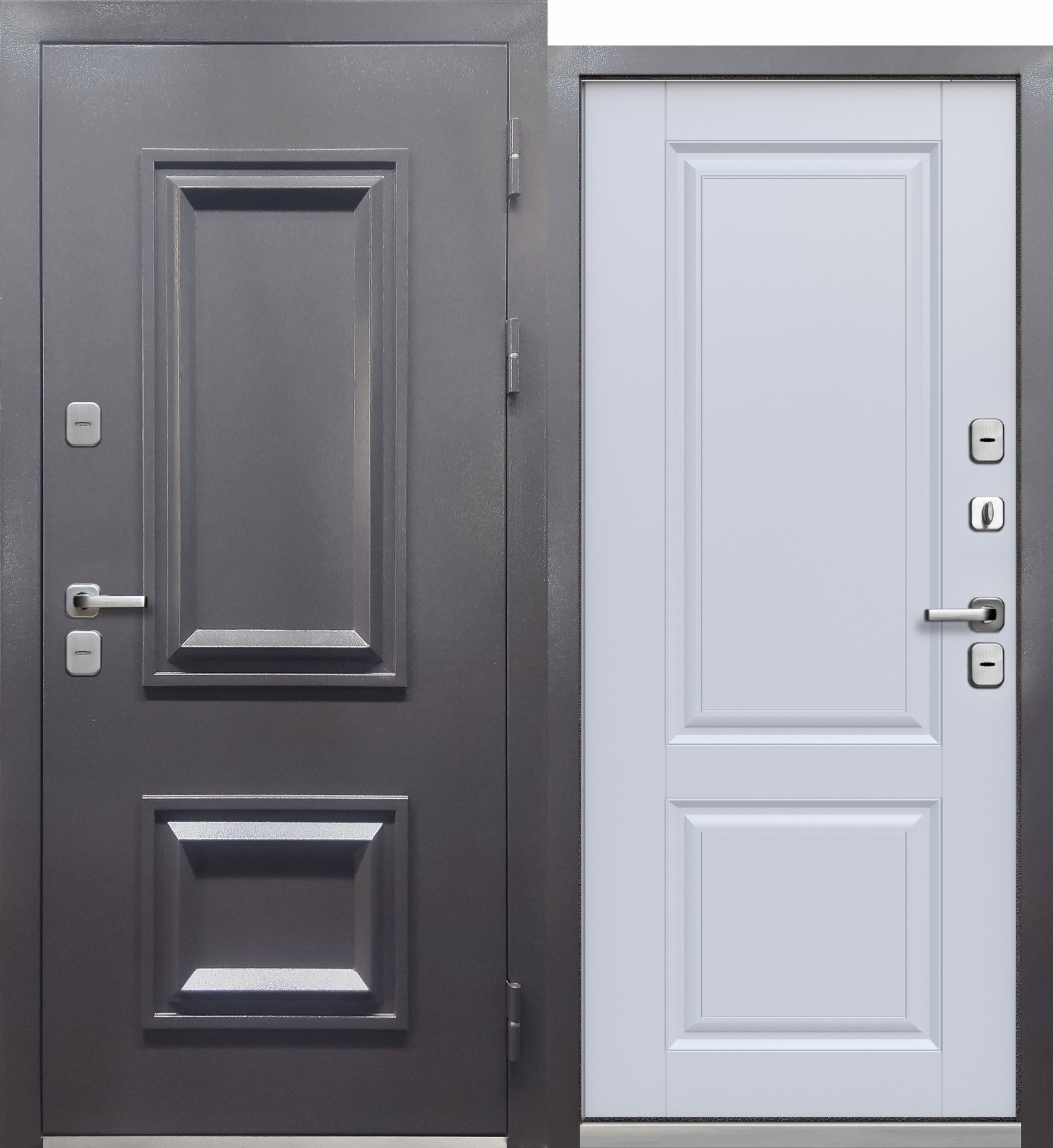 ТЕРМО 2 Букле антрацит Эмалит белый — входная дверь Феррони серии ТЕРМО 2 с терморазрывом на полотне и коробе и внешним покрытием атмосферостойкое порошково-полимерное «Букле антрацит». Доступные размеры: 860x2050, 960x2050 мм.