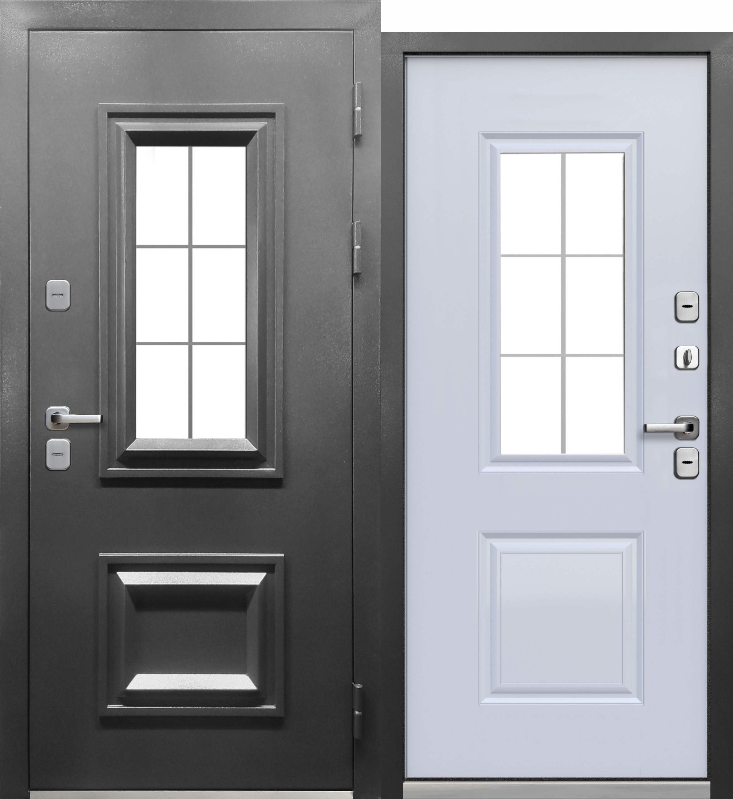 ТЕРМО 3 Букле графит Эмалит белый Ковка — входная дверь Феррони серии ТЕРМО 3 с терморазрывом на полотне и коробе и внешним покрытием атмосферостойкое порошково-полимерное «Букле графит». Доступные размеры: 860x2050, 960x2050 мм.