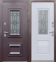 Снаружи модель выполнена в покрытии «букле шоколад», внутри — МДФ-панель 16 мм «Эмалит белый». В стеклопакете используется фигурная вставка, поэтому дверь смотрится мягче и менее строго, чем глухие технические модели.